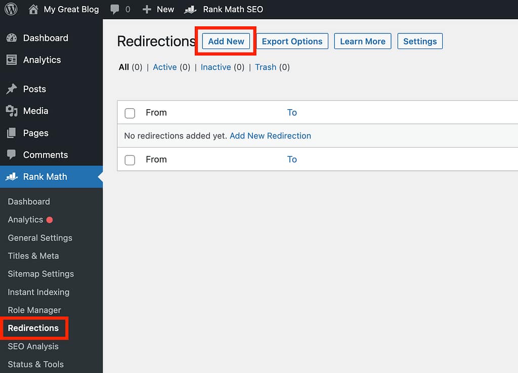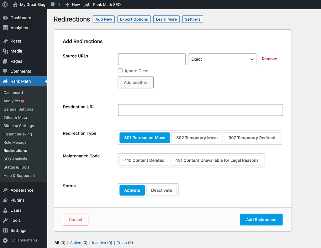 I’ll be using screenshots from Rank Math below, but the steps are virtually identical for the Redirection plugin.