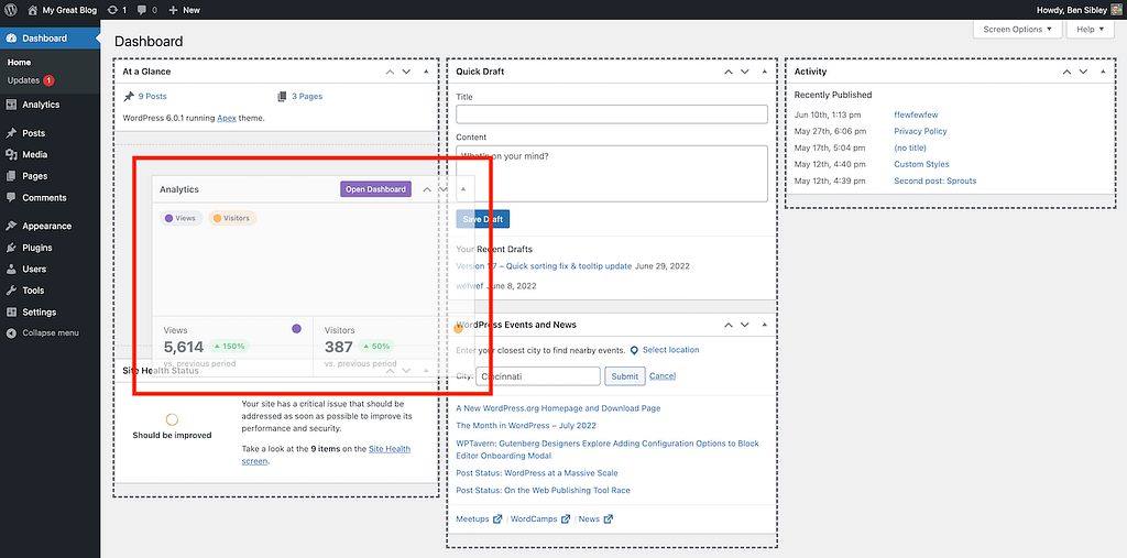 Exactly where it displays in your dashboard depends on how much you’ve customized your widgets already and what widgets other plugins have added.
