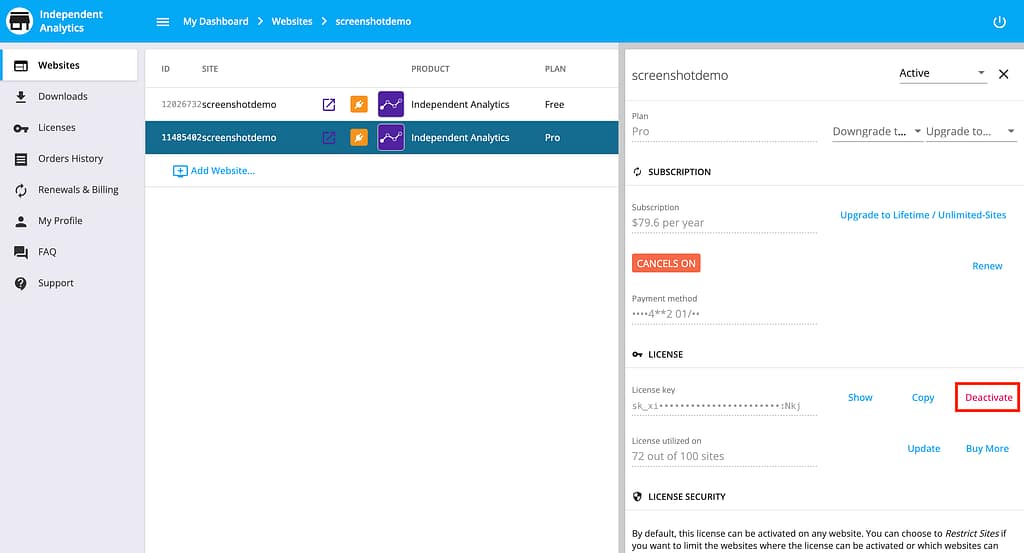 Once logged in, you’ll find yourself in the Websites menu. From here, click on the website where you want to deactivate the license key. A menu will appear on the right side of the screen where you can click the red Deactivate link to disable the license key.