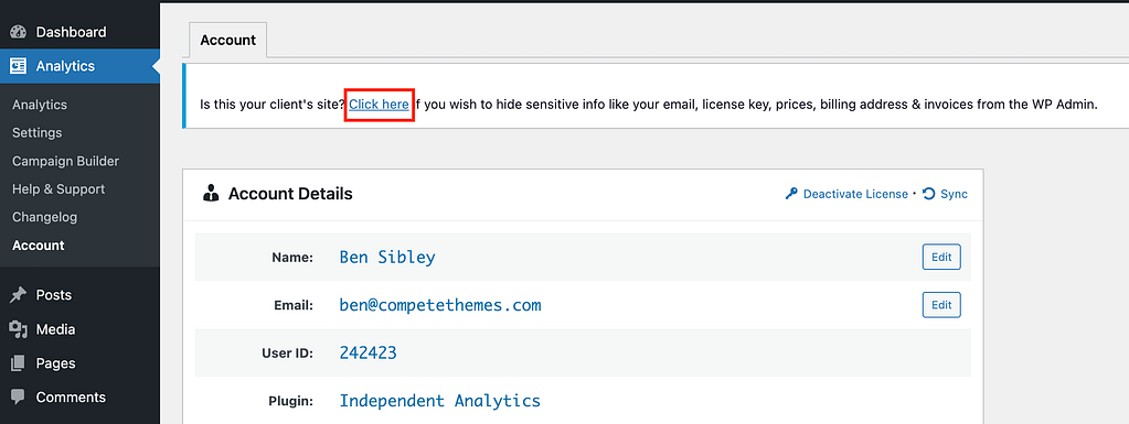 First, if you are logged into a client’s website and visit the Analytics > Account page, you’ll see a notice at the top of the page about hiding your account info. Click on the “Click here” link and your license will be white-labeled.