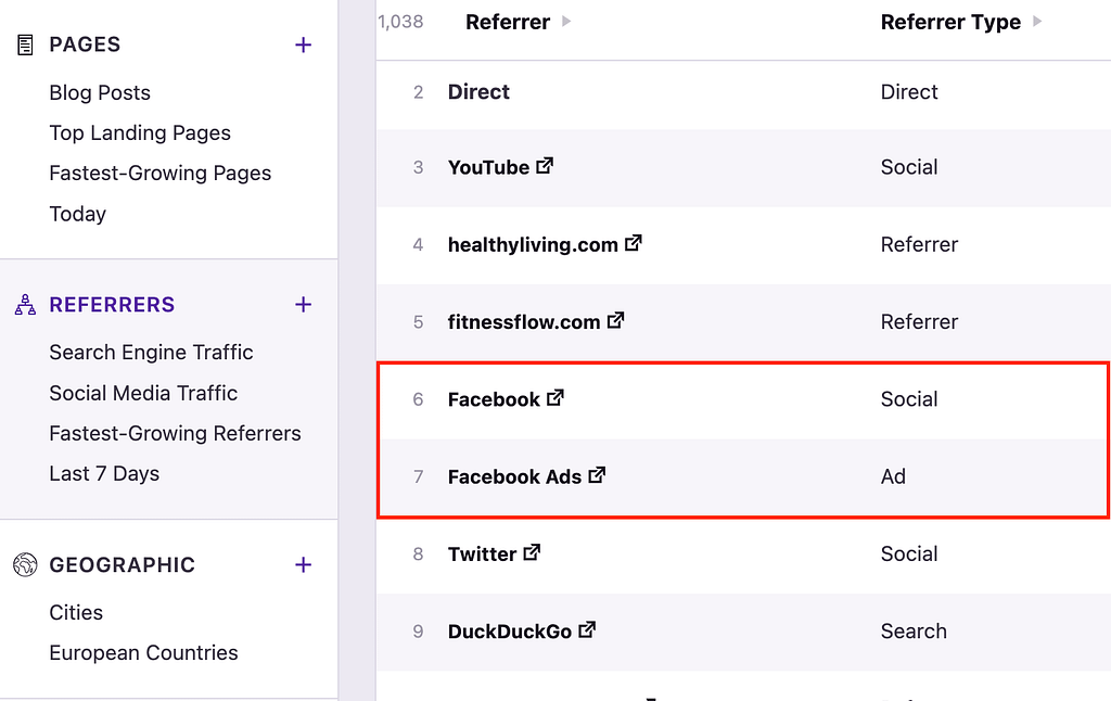 Independent Analytics differentiates between these visitors by checking for the ?fbclid URL parameter that Facebook includes in ads.